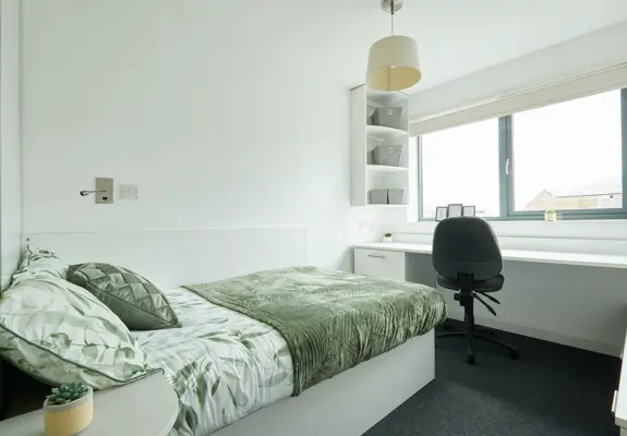 This contemporary en-suite room features a double bed, under-bed storage, and a dedicated study area. You’ll also enjoy a spacious communal kitchen, perfect for catching up with your flatmates.