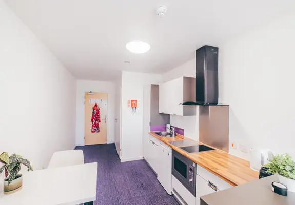 All kitchens are self-catered and are provided with a cooker (induction hob), fridge, freezer (one shelf per student) microwave, kettle, ironing board, and storage units.