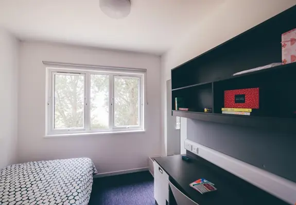 All single rooms are fully furnished with a single bed and mattress (four-foot, small double bed). Plus, you get a desk, chair, bookshelves, a wardrobe, a bin, mirror, and integrated desk light.